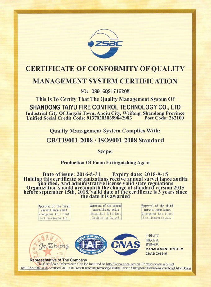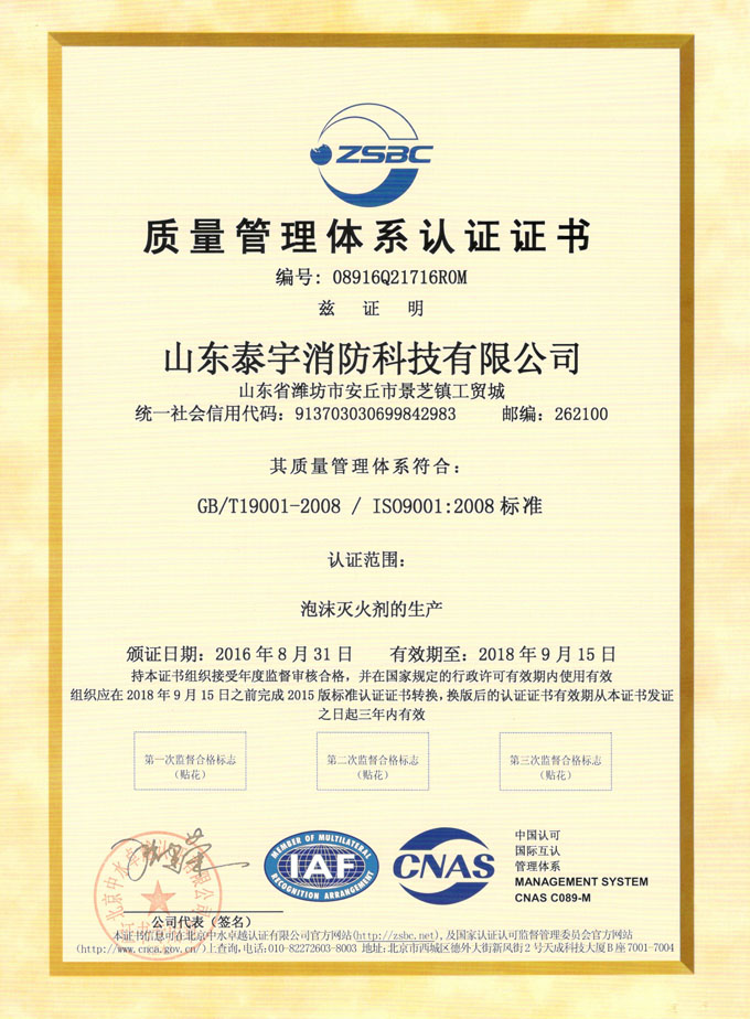 山东泰宇ISO9001:2008质量管理体系认证证书